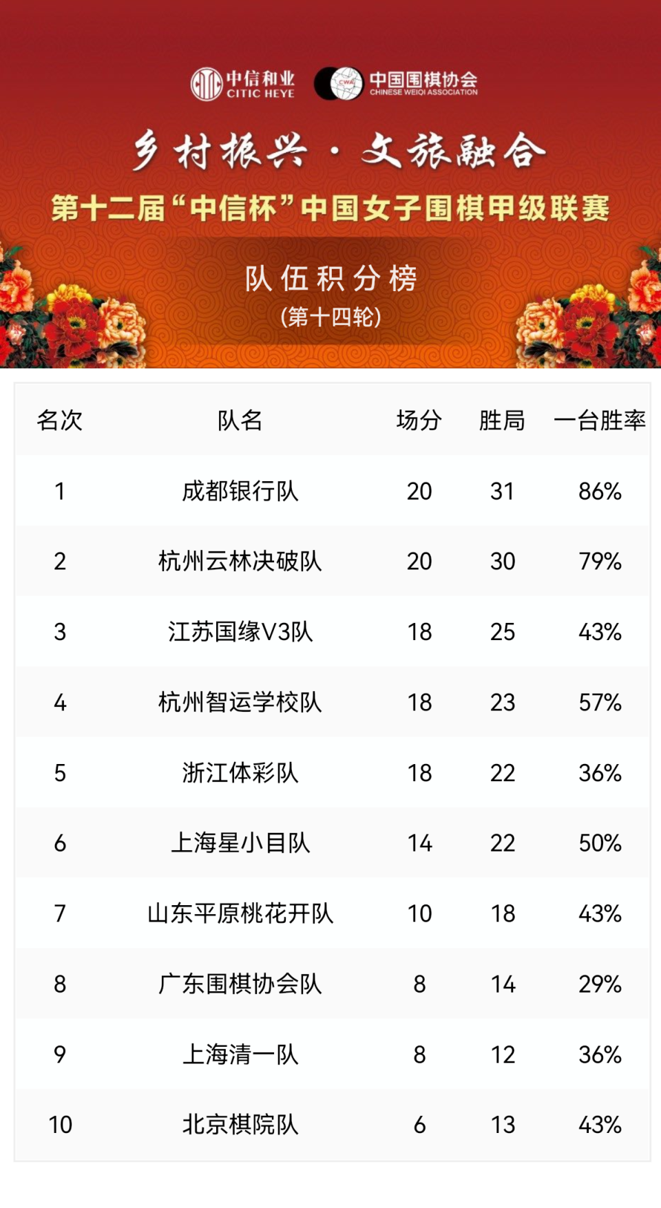 特约记者古柯报道 10月30日,2025年第12届“中信杯”中国女子围甲联赛第14轮比赛在各主场战罢,领跑的卫冕冠军成都银行队1比2不敌杭州智运学校队,仍以1个局分优势领先第二名杭州云林决破队;广东围棋协会队陈一鸣五段回归,全队2比1胜北京棋院队,终结4连败。